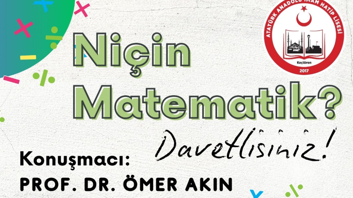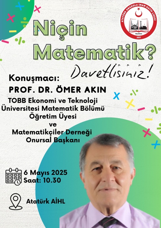 Matematik kulübümüzün düzenlediği “Niçin Matematik” isimli söyleşi, TOBB Ekonomi ve Teknoloji Üniversitesi öğretim üyesi ve Matematikçiler Derneği onursal başkanı Prof. Dr. Ömer AKIN tarafından 06.05.2025 tarihinde okulumuzun konferans salonunda gerçekleşecektir.